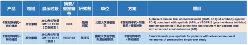 在黑色素瘤领域,凯发k8医药的卡瑞利珠单抗联合阿帕替尼(“双艾”组合)在2022 ASCO共入选1项口头报告和1项壁报展示。
