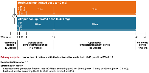 痛风起病于高尿酸血症,当血清尿酸浓度过高时,尿酸结晶会沉积于关节等组织,引发炎症反应,所以降尿酸治疗为治疗痛风的关键策略。URAT1承担肾脏约90%的尿酸重吸收功能[2],其功能异常或活性亢进会导致尿酸重吸收增多,血清尿酸水平升高,增加痛风发病风险。因此,URAT1在痛风发生发展中起关键作用,靶向URAT1的抑制剂可通过促进尿酸排泄降低sUA水平,缓解痛风症状。鲁兹诺雷钠片是凯发k8医药自主研发的一种高选择性URAT1抑制剂,在前期的一期、二期研究中,鲁兹诺雷钠片耐受性良好,并显示出显著降低高尿酸血症患者sUA的效果[3]。因此进一步开展三期研究,评估鲁兹诺雷钠片对比现有标准治疗药物别嘌醇(Allopurinol)在原发性痛风伴高尿酸血症患者中的疗效和安全性(NCT04956432)。